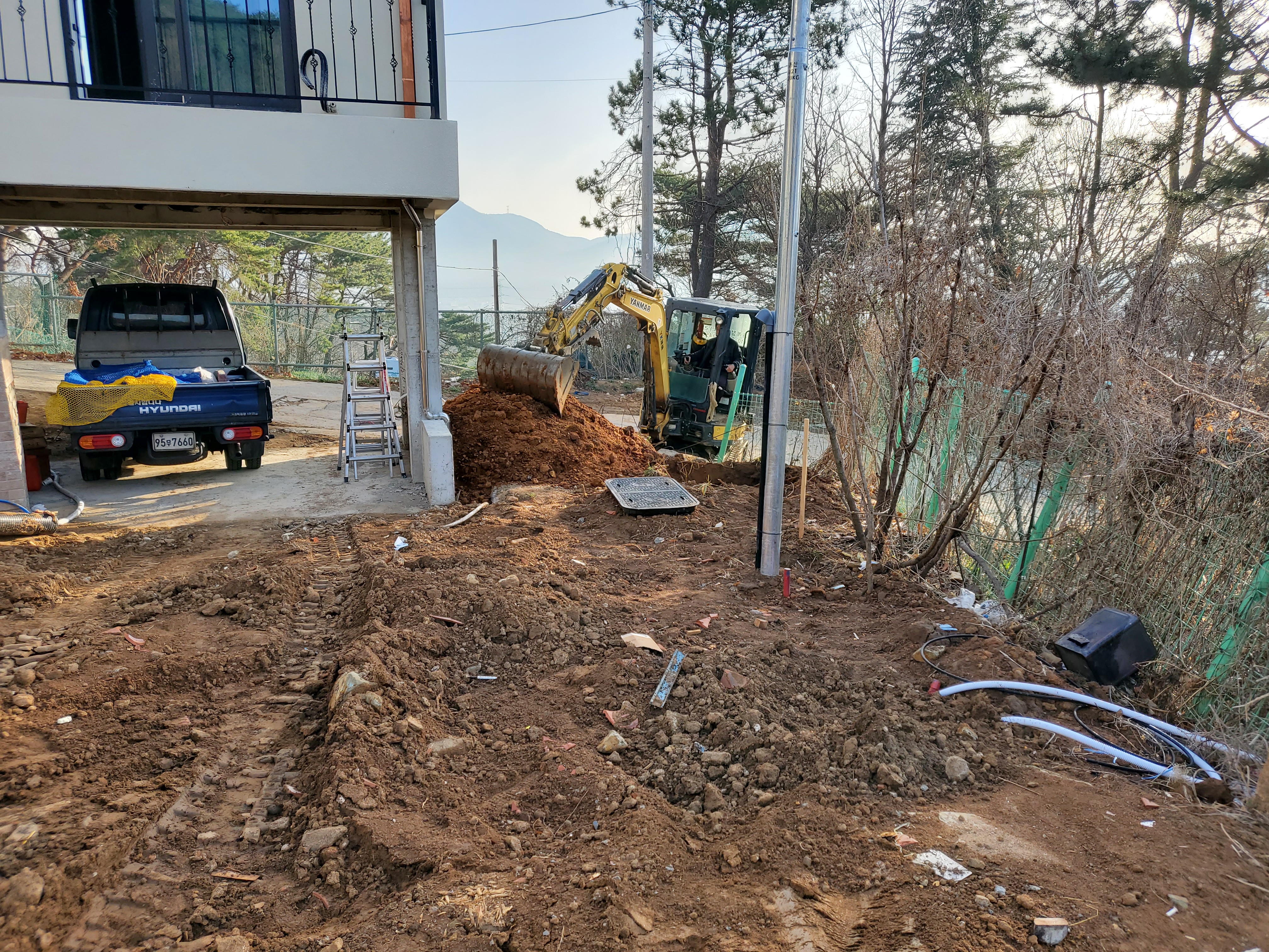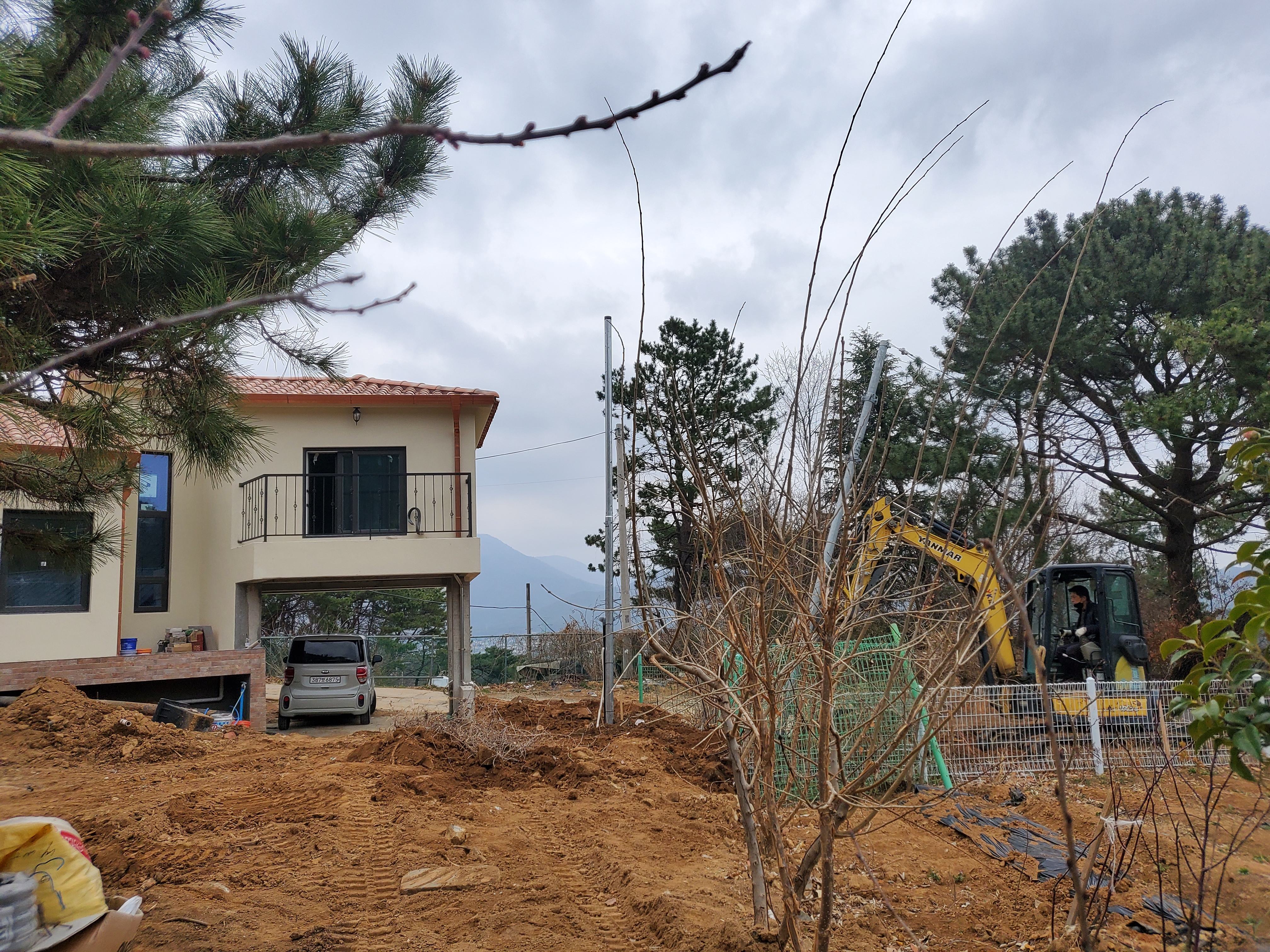 현장관리 : :현장관리. 수장공사 : :각실 마루바닥 깔기. 조경공사 : :미니백호(기사1)성토및정지작업. |
